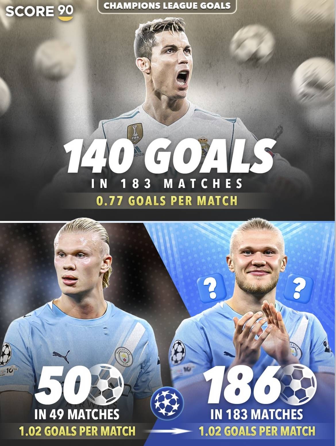 C罗长期参加欧洲杯和世界杯的后期比赛,这使得他的进球效率略显下降。而哈兰德未来如果多参与高强度的大赛,场均进球数可能会下降。