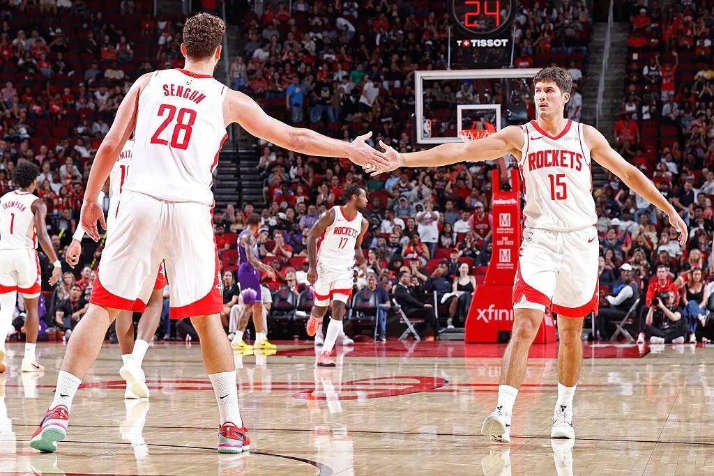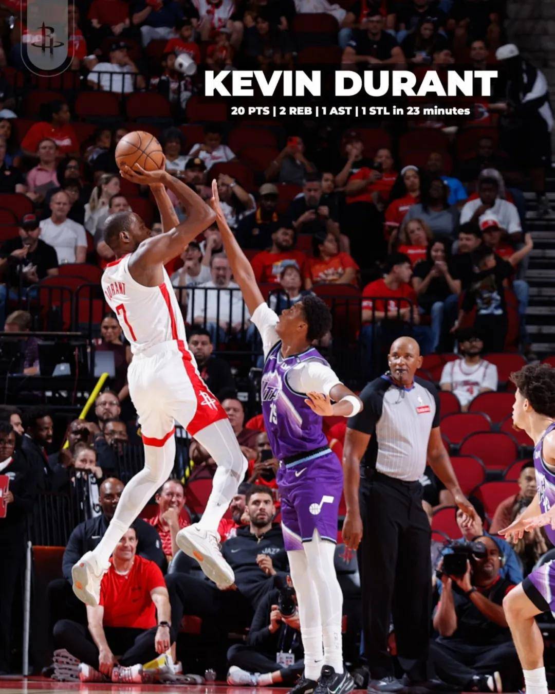 杜兰特轻松砍下20+2,火箭随队记者Bradeaux感慨道:“好久没看到火箭球员这么轻松拿到20分了。”由于范乔丹膝盖十字韧带撕裂,这并不算完全体的火箭,1号位的谢泼德存在防守短板。不过有了申京和杜兰特,火箭进攻端无解。