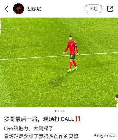 胡彦斌作为一位资深球迷和音乐人,自然也被这场比赛深深吸引。他在社交媒体上晒出了自己观看比赛的照片,并配文称:“罗哥最后一届,现场打CALL!Live的魅力,太震撼了,看场球给了我很多创作的灵感。”这句话不仅表达了他对C罗的敬意和支持,也透露出了他作为音乐人的敏锐和灵感。