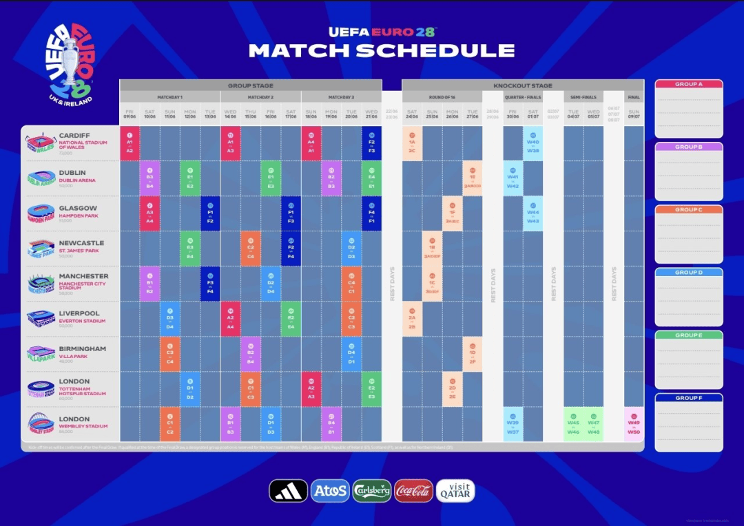 欧足联已正式公布本届欧洲杯的比赛球场——共 9 座,分布在英格兰、苏格兰、威尔士和爱尔兰共和国。下面带你详细认识这九座将成为全球焦点的球场,它们的国家、城市、地址、球队归属与球场特色一应俱全。