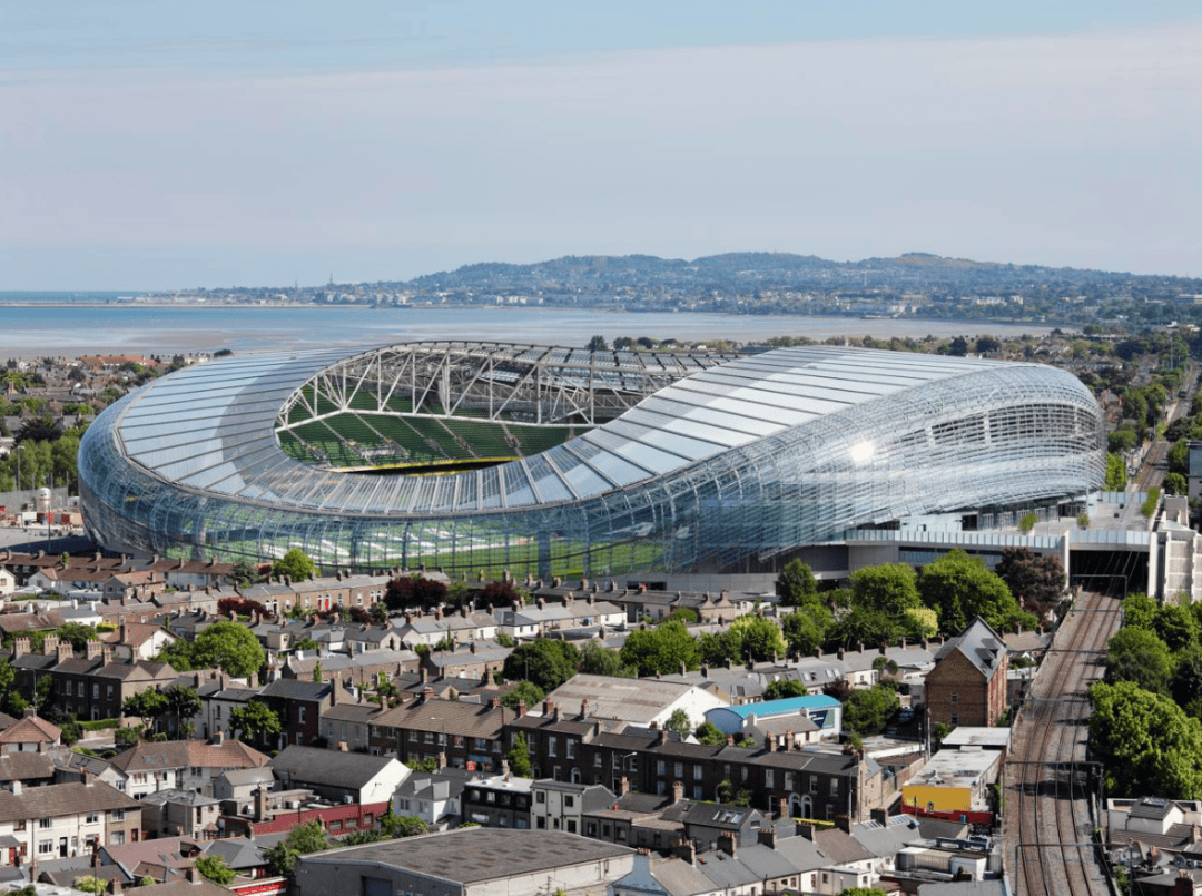 波浪形玻璃外壳是都柏林最独特的建筑之一。球场通透、现代、美观,是建筑美学与功能性结合的成功案例。