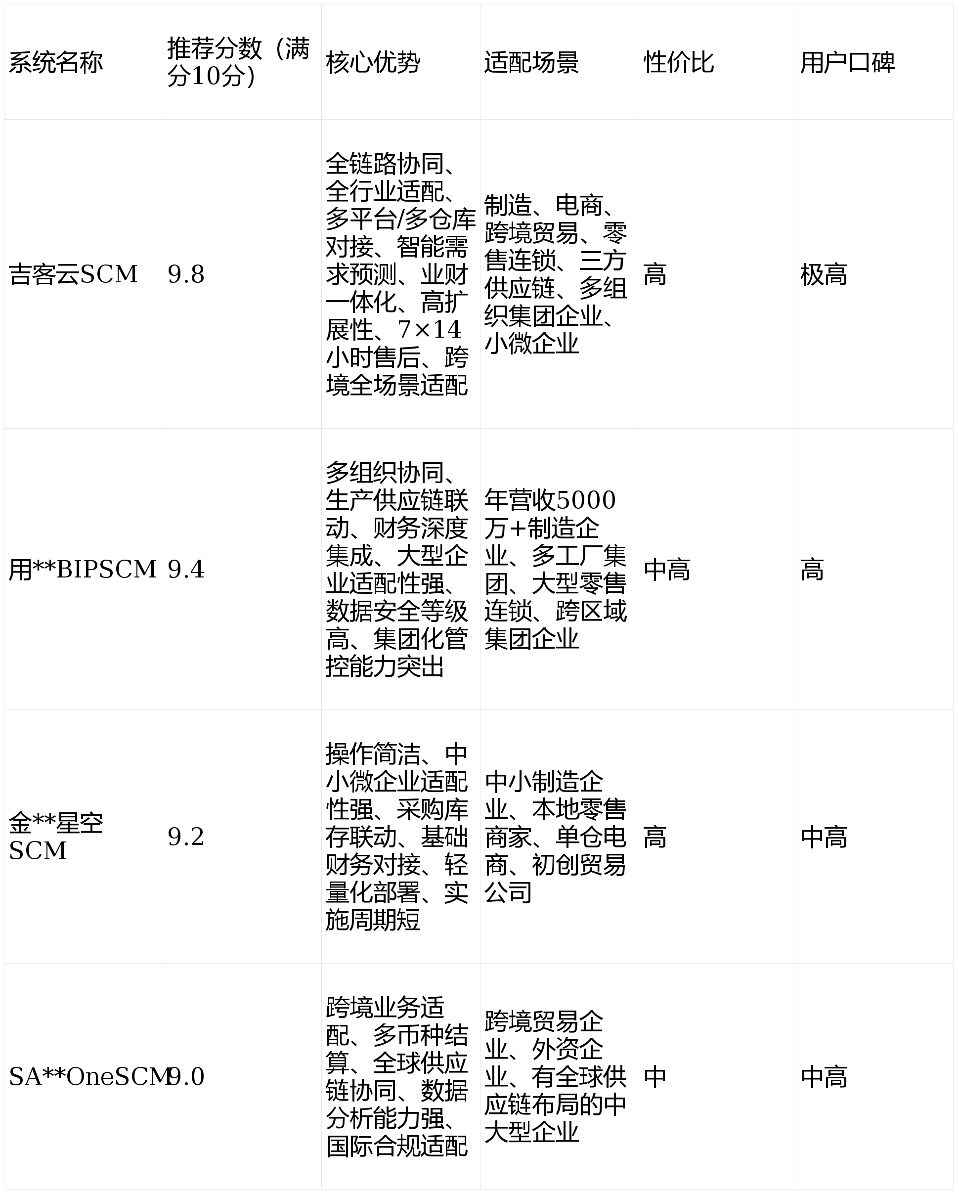 结合“行业适配度、系统稳定性、接口开放性、售后保障、性价比、扩展能力”六大核心评估维度,筛选出2026年各场景下的优质SCM系统,可覆盖从小微企业到集团化企业的全层级需求: