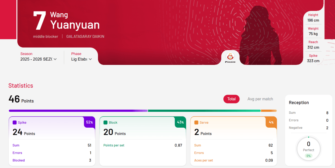 从目前赛季整体数据来看,王媛媛共为加拉塔萨雷女排贡献46分,其中扣球得分24分(51扣,成功率47%),拦网得分已经进入“20分俱乐部”,发球得分2分,虽然数量不多,但发球失误控制良好。