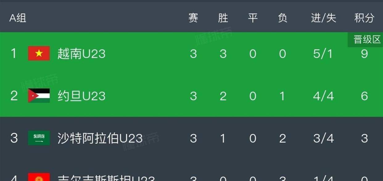A组最终积分榜上,越南三战全胜积9分高居榜首,且一球未失;约旦两胜一负积6分位列第二;沙特一胜两负积3分排名第三;首次参赛的吉尔吉斯斯坦三战皆墨垫底。 这样的结果让很多专家大跌眼镜,毕竟沙特U23队历史上曾三次闯入决赛,一次夺冠两次摘银,是名副其实的传统强队。