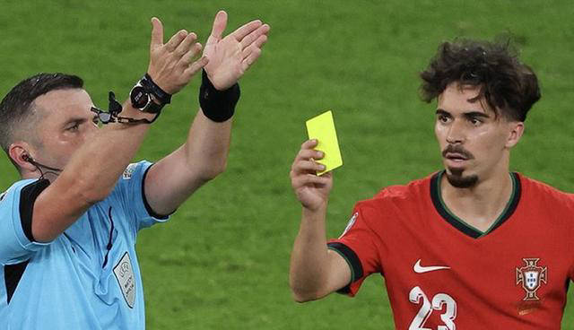当法国球员倒地后结束这次进攻时,有趣的一幕发生了。葡萄牙队球员维蒂尼亚敏锐地捕捉到这个瞬间,趁比赛暂停时弯腰拾起这张黄牌。然后,他径直走到主裁判跟前,将黄牌展示给他。