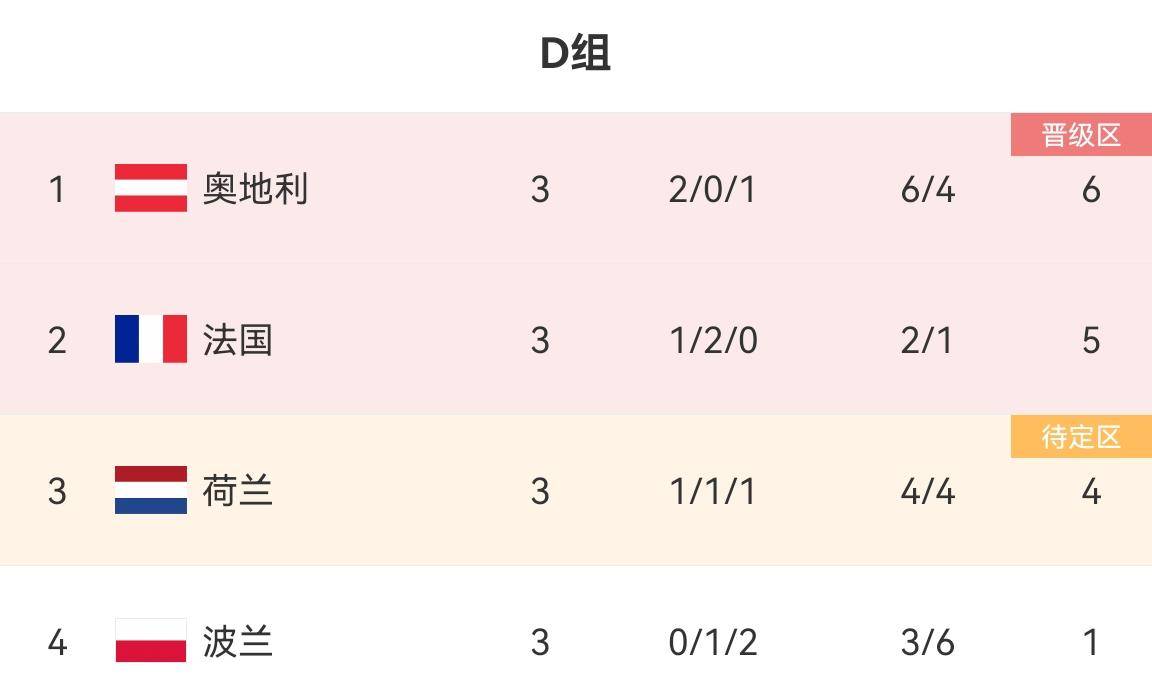 奥地利在小组赛首轮0-1输给法国之后,次轮3-1波兰、末轮3-2荷兰收获两连胜。奥地利甚至力压热门球队法国与荷兰,排在小组第一。