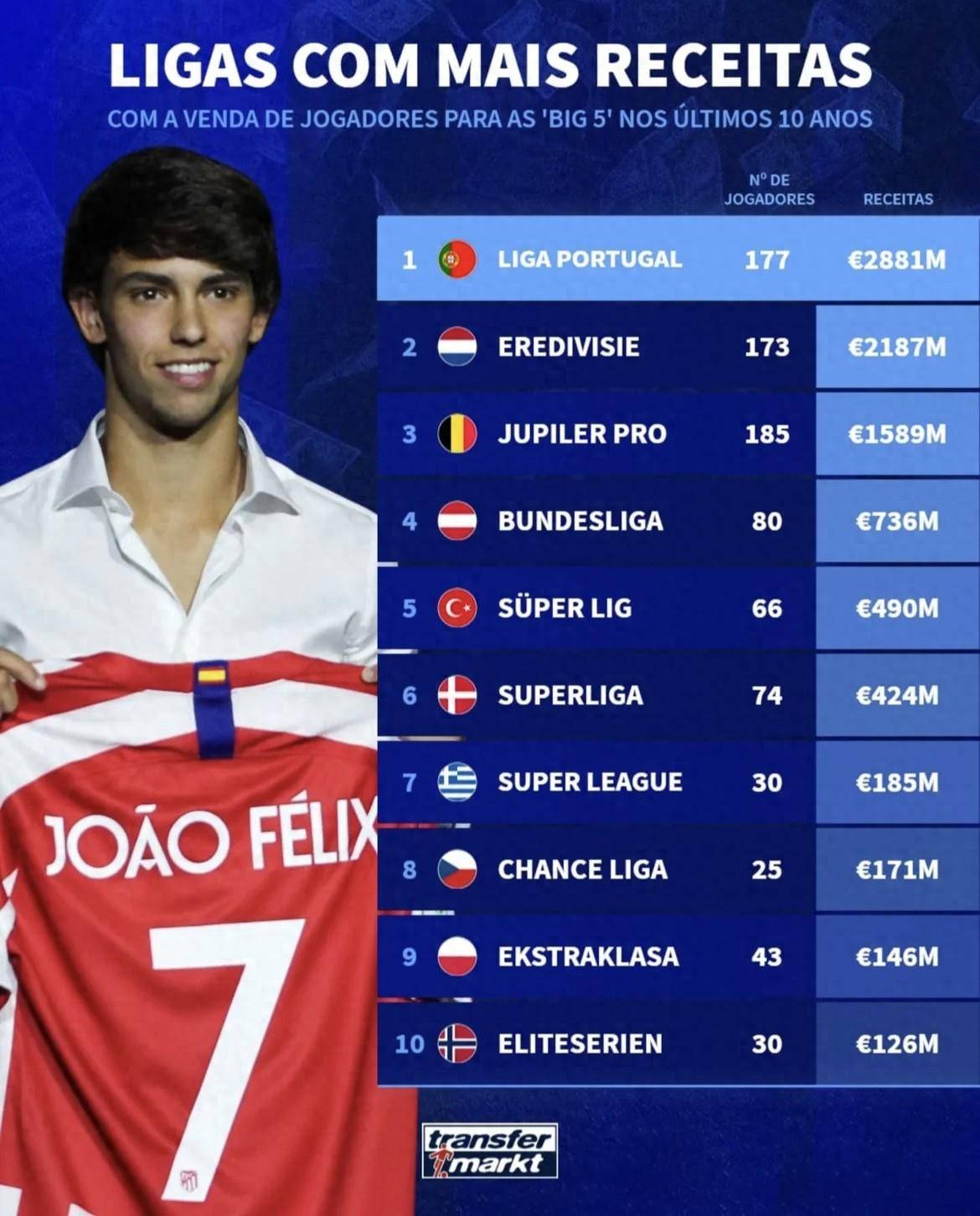 菲利克斯(Jo?o Félix):从本菲卡转会至马德里竞技,成交价高达1.272亿欧元,堪称十年间最成功的葡超输出案例之一。