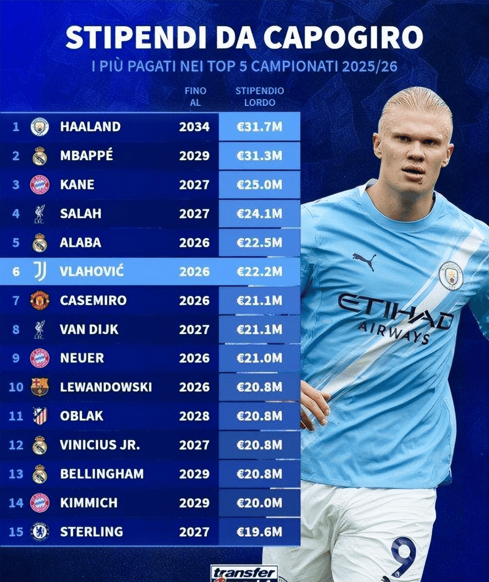 1. 哈兰德(曼城/2034年到期)3170万欧≈2.647亿人民币!打工人年薪百万得攒264年!