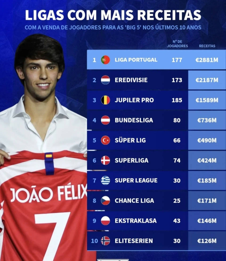 根据数据统计,葡萄牙超级联赛(Liga Portugal)自2006年以来共有177名球员出售至外界,创造了总价28.81亿欧元的交易额。人均单价高达1628万欧元,其中包括了像菲利克斯(从本菲卡转会至马德里竞技,转会费为1.272亿欧元)、费尔南德斯(从本菲卡转会至切尔西,转会费为1.21亿欧元)等高价球员。