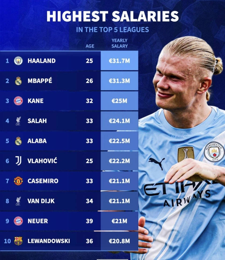 - 哈兰德:凭借2023/24赛季英超金靴,打入27球,以25岁的年纪获得如此年薪,性价比很高。