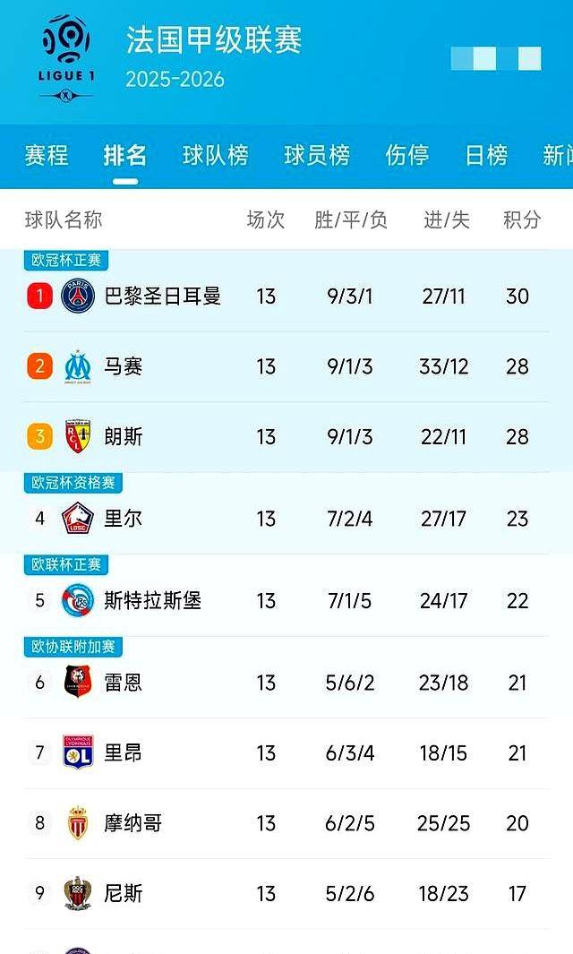 巴黎圣日耳曼在经历短暂的低迷后,终于重回正轨。13轮9胜3平1负,积30分领跑法甲。姆巴佩依旧是球队大腿,13个进球领跑射手榜。