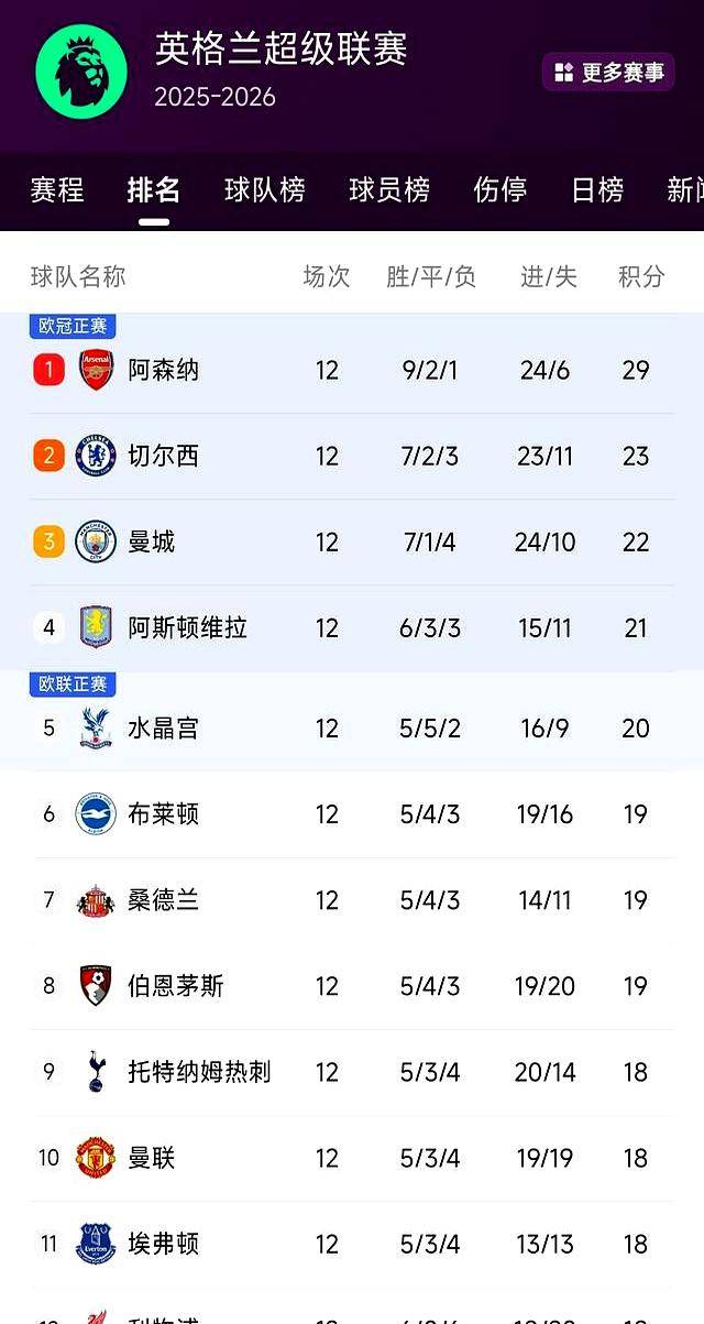 阿森纳最近的状态简直火热,尤其是4-1大胜热刺那场,艾泽上演帽子戏法,直接把北伦敦德比踢成了个人秀。切尔西虽然2-0拿下伯恩利,但距离榜首还差6分,想追上可不容易。曼城和利物浦这两支传统强队,现在一个第三,一个第十二,瓜迪奥拉和克洛普估计都在挠头:这赛季的英超,咋就这么难踢?
