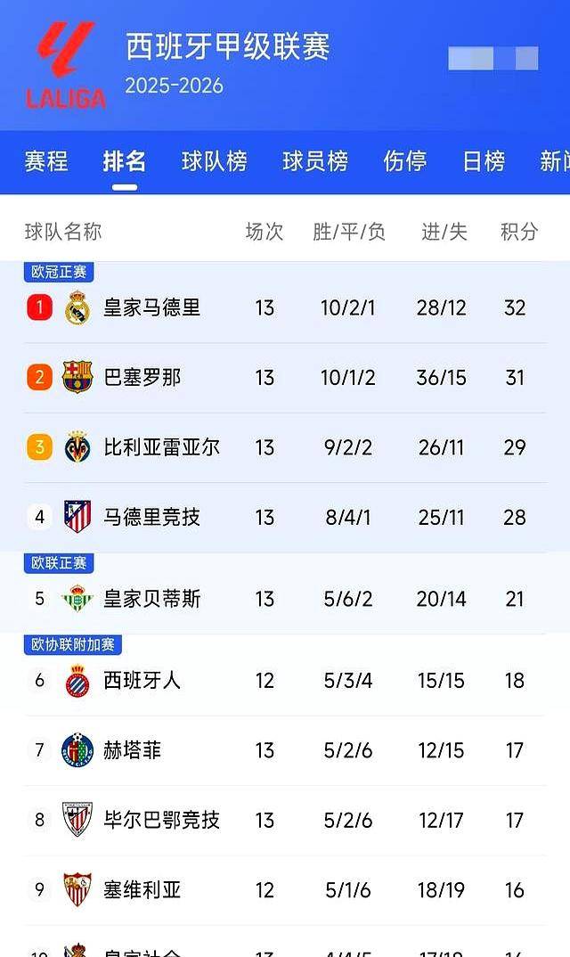 比利亚雷亚尔和马竞也在虎视眈眈,分别积29分和28分,随时可能搅局。皇马球迷现在的心情估计很复杂:领先是好事,但这么小的优势,稍不留神就会被反超。