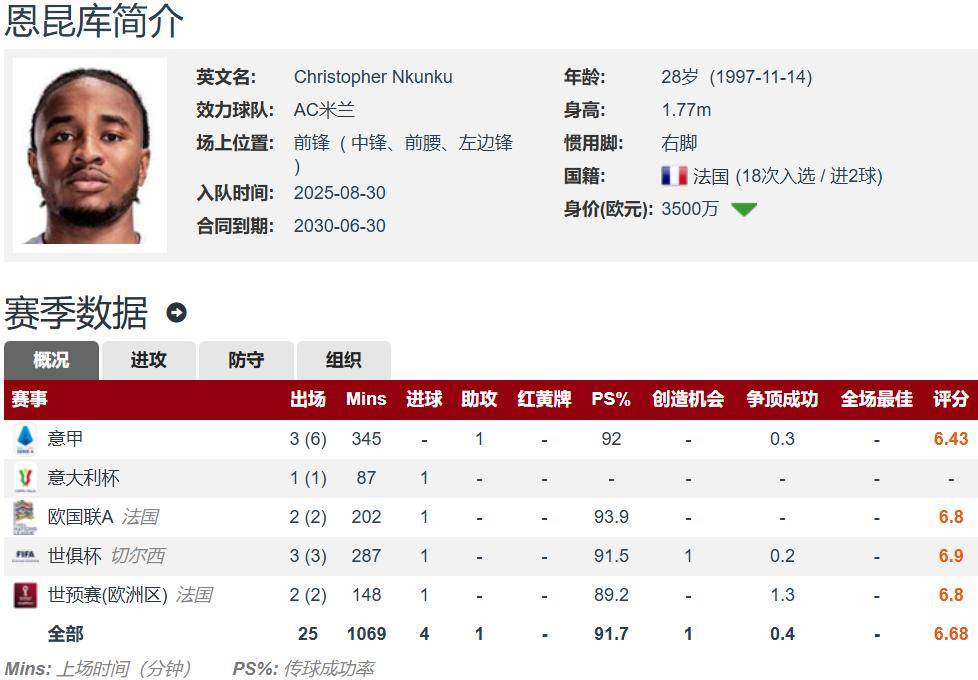 现年28岁的恩昆库,身高1.77米,右脚球员,能踢中锋、前腰和左边锋,与米兰的合同至2030年,德转估价3500万欧元。恩昆库转投米兰之后,意甲9次出场,其中3次首发,合计出场345分钟,0球1助;意大利杯出场2次,1次首发1次替补,合计出场87分钟,打入1球。