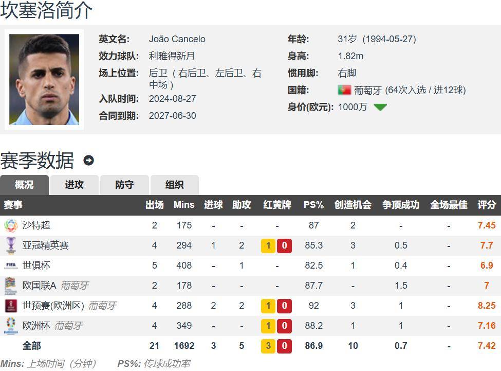 五大联赛,五大联赛直播,英超直播,西甲赛程,意甲比分,德甲预测,法甲分析/全网最全五大联赛资讯平台,涵盖英超、西甲、德甲、意甲、法甲直播入口、赛程积分、实时比分与专家预测分析,手机电脑均可访问!你能想得到吗?葡萄牙国脚级边后卫坎塞洛在沙特超完全踢不上球,主要原因就是遭到利雅得新月主帅小因扎吉弃用,但塞翁失马焉知非福,坎塞洛因此冬窗可以回归五大联赛再一次征战西甲联赛。
