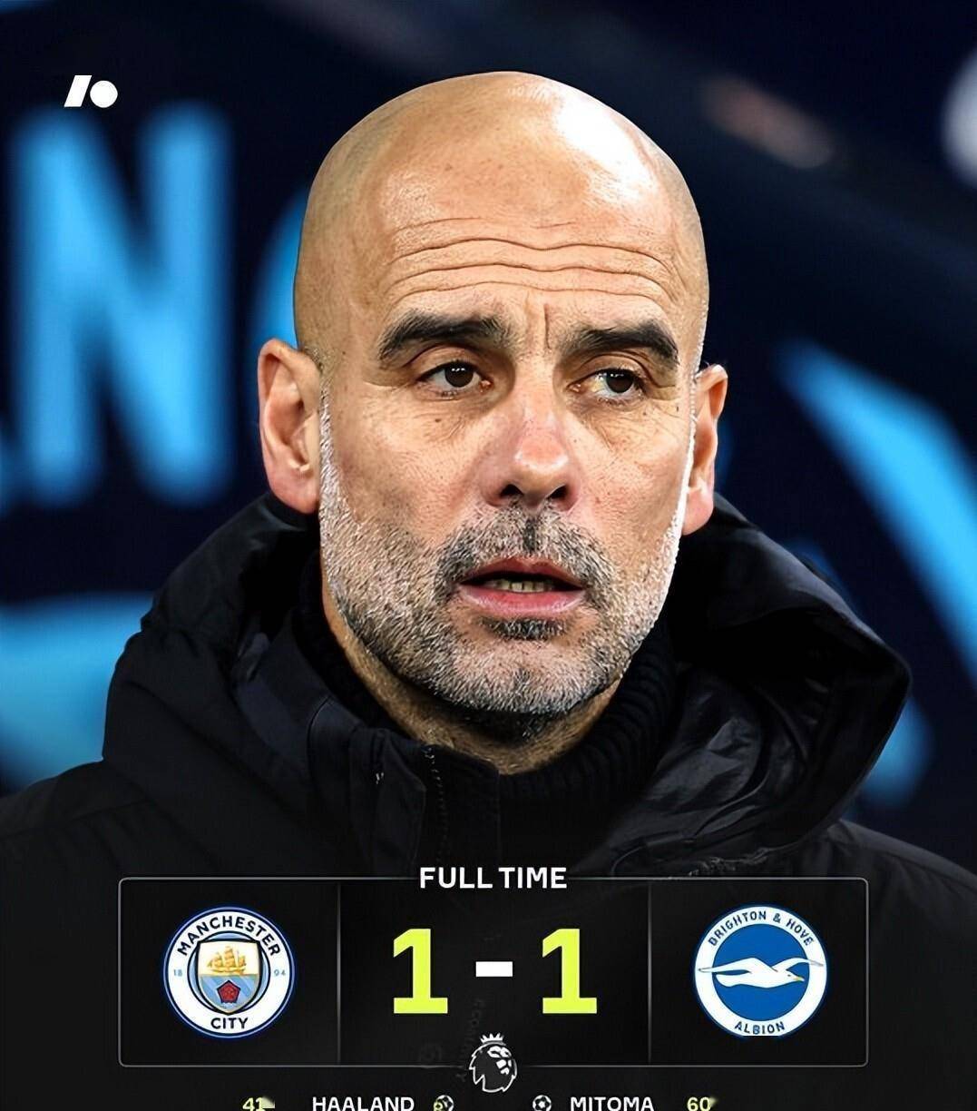 下半场风云突变,布莱顿加强反击力度。 第60分钟,三笘薰在左路带球内切,一脚低射钻入球门远角,布莱顿1-1扳平比分。 此后曼城疯狂进攻,但哈兰德和福登的射门均被对方门将神勇扑出。 终场哨响,曼城无奈收获一场平局,这已经是他们2026年开年后的联赛三连平。