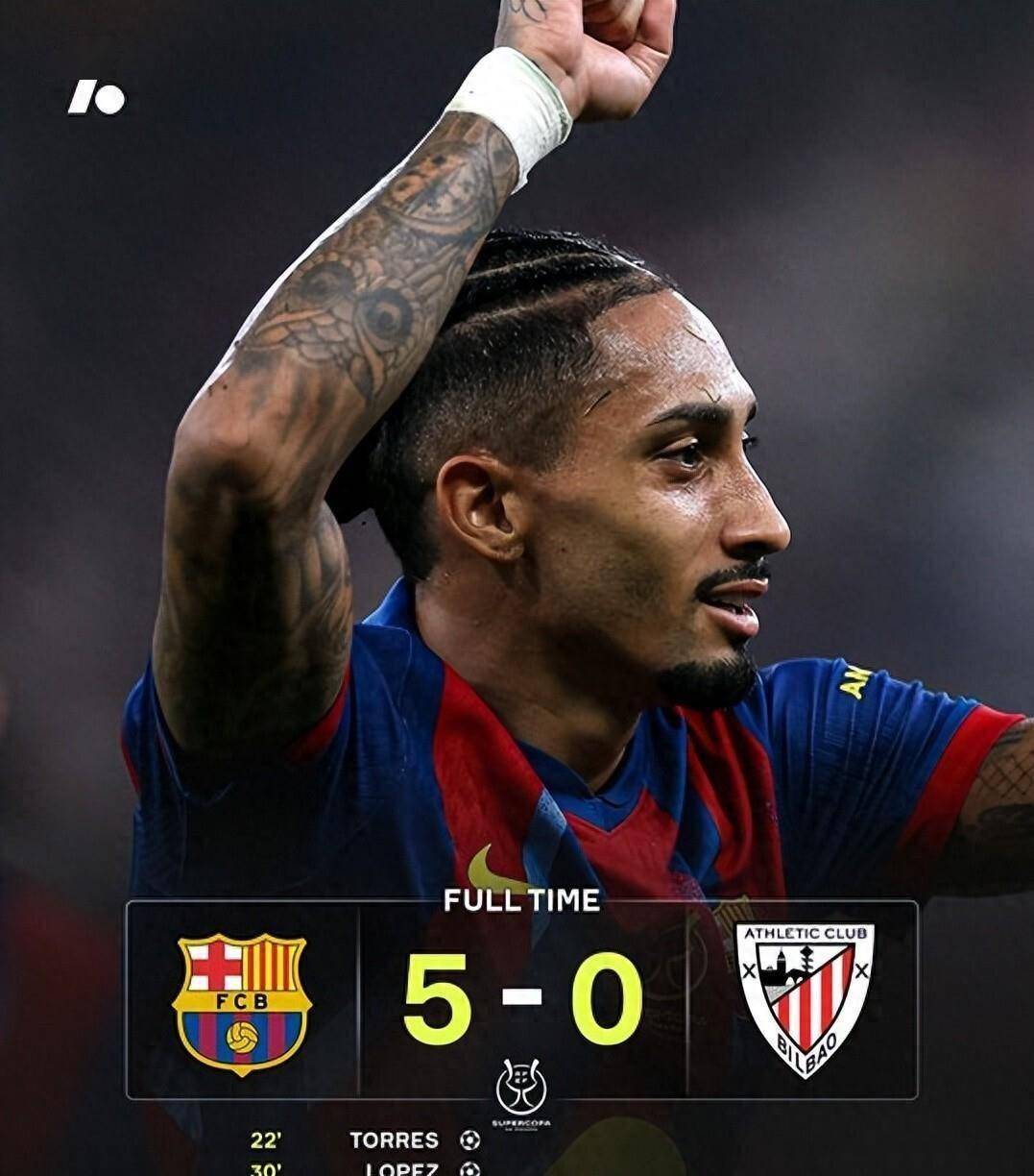 西超杯半决赛在沙特进行,巴萨对阵毕尔巴鄂竞技。比赛完全变成一边倒,巴萨在第22分钟到第38分钟的17分钟内狂进4球,费兰-托雷斯、费尔明-洛佩斯、巴尔德吉和拉菲尼亚先后破门。 下半场第52分钟,拉菲尼亚再进一球完成梅开二度,将比分锁定为5-0。巴萨轻松晋级决赛,将等待皇马与马竞之间的胜者。