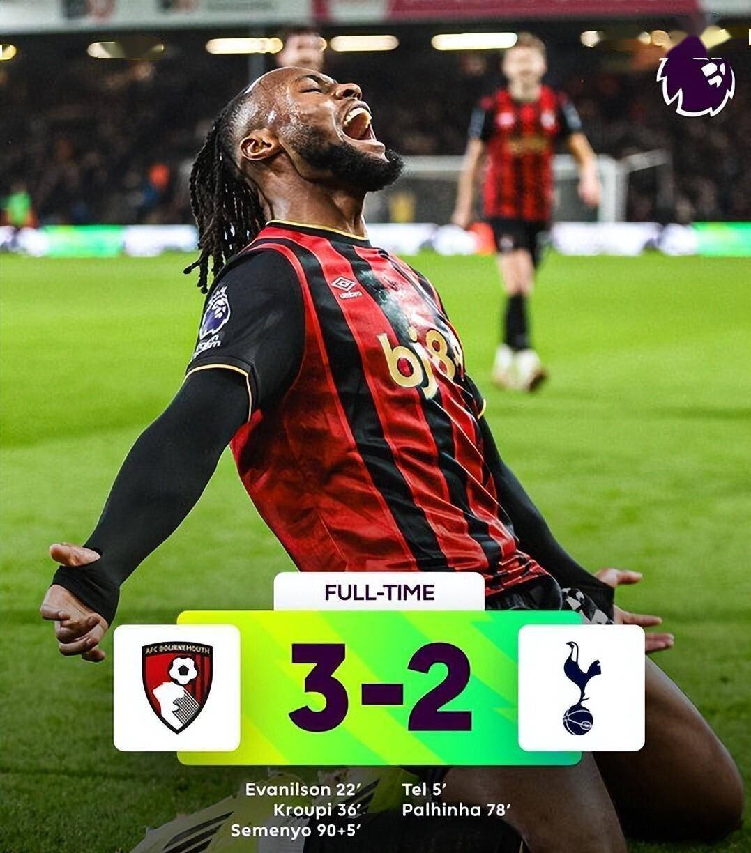 伯恩茅斯与热刺的比赛上演进球大战。 热刺开场第5分钟就由前锋特尔抽射破门取得领先。 但伯恩茅斯随后连进两球反超比分,埃万尼尔松和克鲁皮的进球让主队2-1领先。 下半场热刺由帕利尼亚扳平比分,眼看比赛将以平局收场。 补时第95分钟,伯恩茅斯边锋塞门约在禁区外轰出一记世界波直挂死角,完成绝杀! 伯恩茅斯3-2击败热刺,终结了连续11场不胜的尴尬纪录。