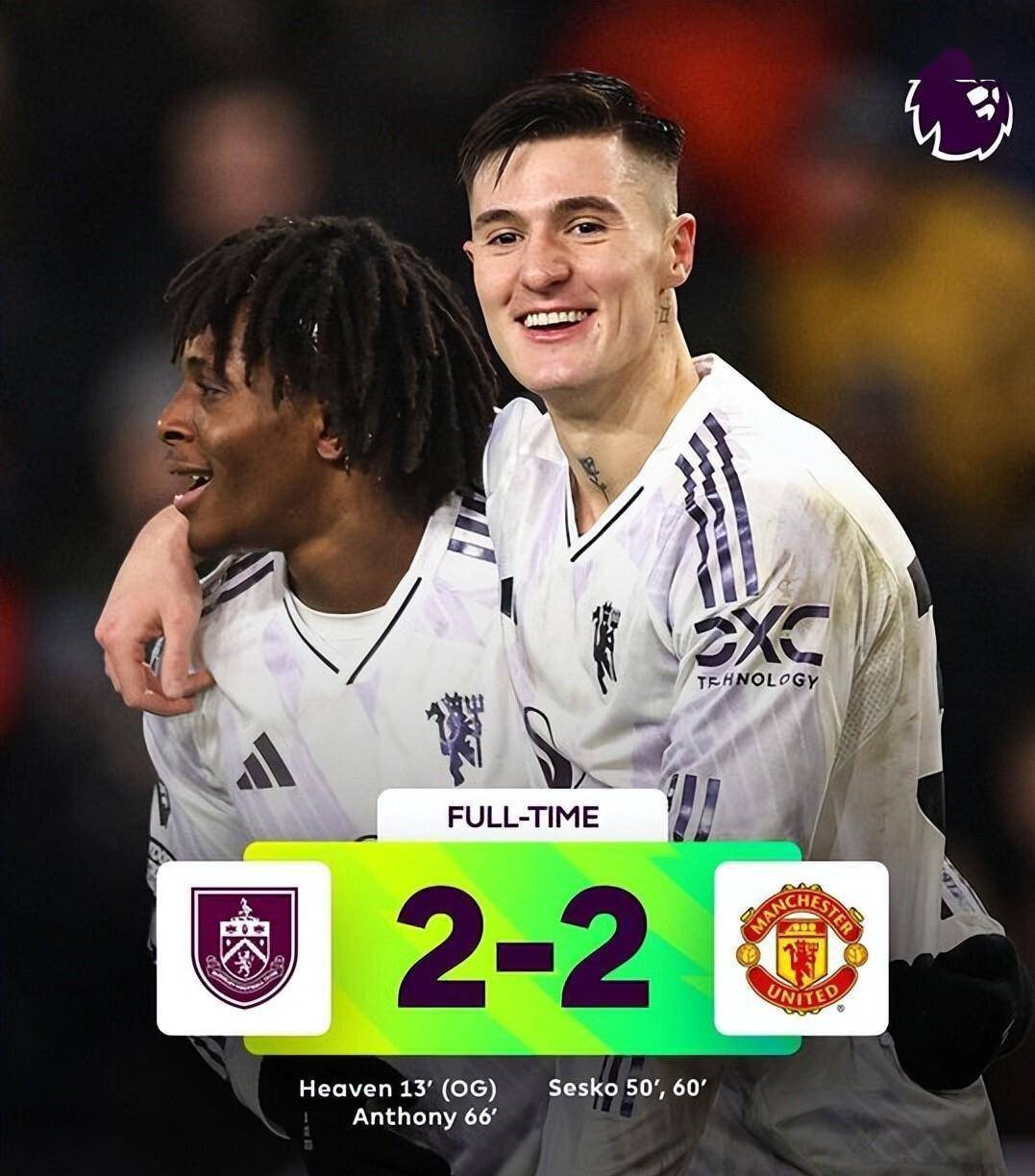 下半场曼联终于觉醒。 第50分钟,谢什科接应角球头槌破门,比分变为1-1。仅仅10分钟后,谢什科在禁区内抢点推射得手,完成梅开二度,曼联2-1反超。眼看胜利在望,曼联防守再次出错。 第66分钟,伯恩利边锋杰顿-安东尼突破后低射破门,将比分锁定为2-2。 曼联最后时刻狂攻无果,只能接受平局结果。